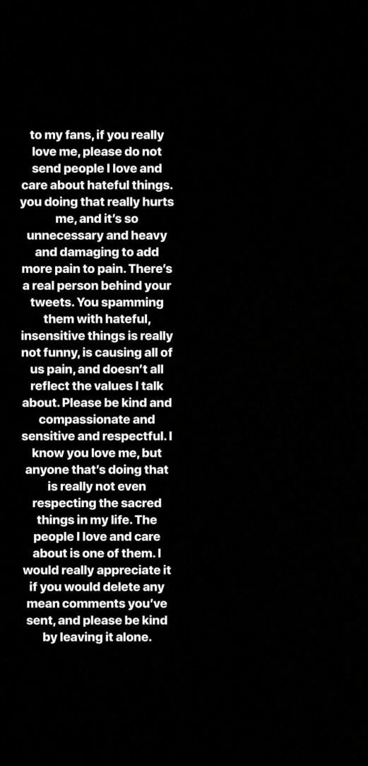 A mes fans, si vous m'aimez, s'il vous plaît, n'envoyez plus de propos blessants à des gens que j'aime et qui compte pour moi. Le fait que vous le fassiez me blesse énormément. Il y a une vrai personne derrière vos tweets. Envoyer de la haine ce n'est pas marrant et ça nous cause à tous de la peine.