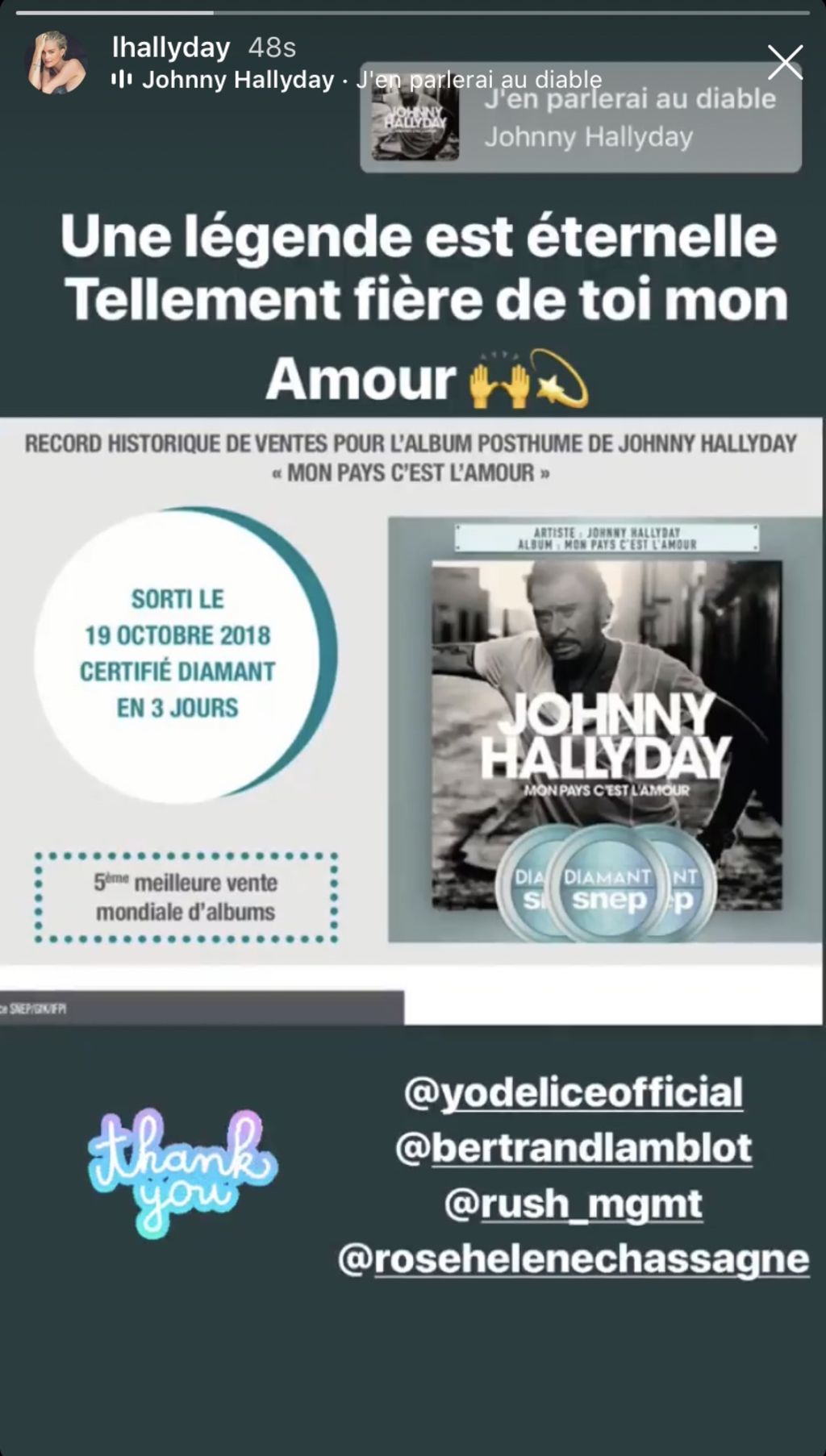 Laeticia Hallyday aime parler de son mari disparu en décembre 2017. Elle souhaite prouver à tout le monde qu’elle n’oublie pas celui qui a partagé sa vie. Ainsi, la maman de Joy et Jade a fait savoir combien elle était fière de son défunt mari. Laeticia Hallyday a posté un message sur sa story Instagram afin de rappeler que la musique de Johnny est éternelle. Preuve en est avec les ventes de son album posthume, Mon pays c'est l'amour.