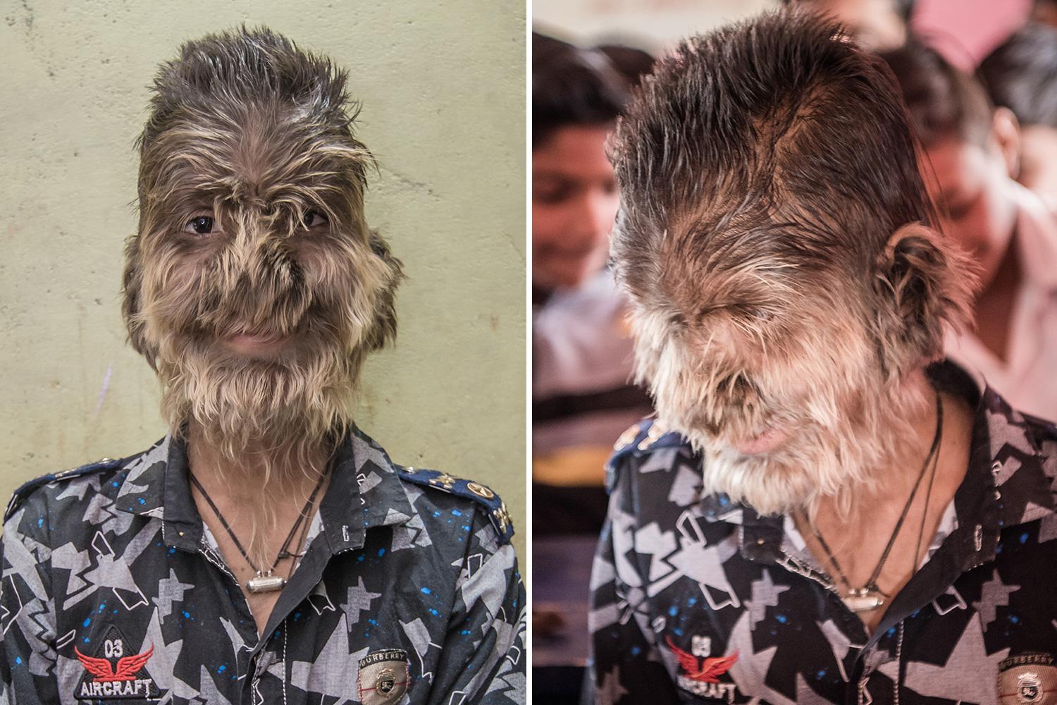 Originaire de l’Inde, cet adolescent de 13 ans a l’intégralité du corps recouvert de poils. Il souffre du syndrome du loup-garou.