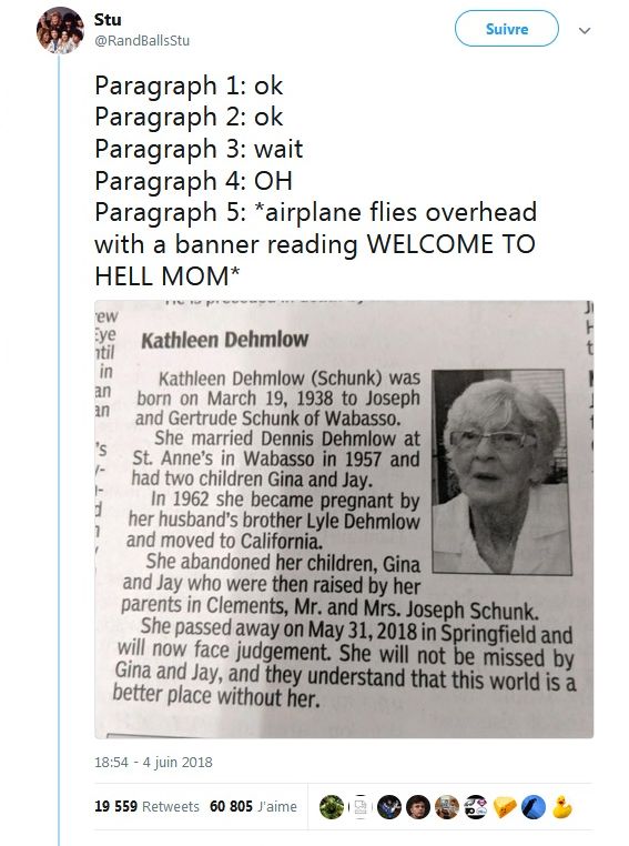En postant la nécrologie sur Twitter, un internaute a alors fait le buzz. Sur celle-ci, on apprend que Kathleen Dehmlow s’est mariée en 1957 avec Dennis Dehmlow. Ensemble, ils ont eu deux enfants, Gina et Jay.