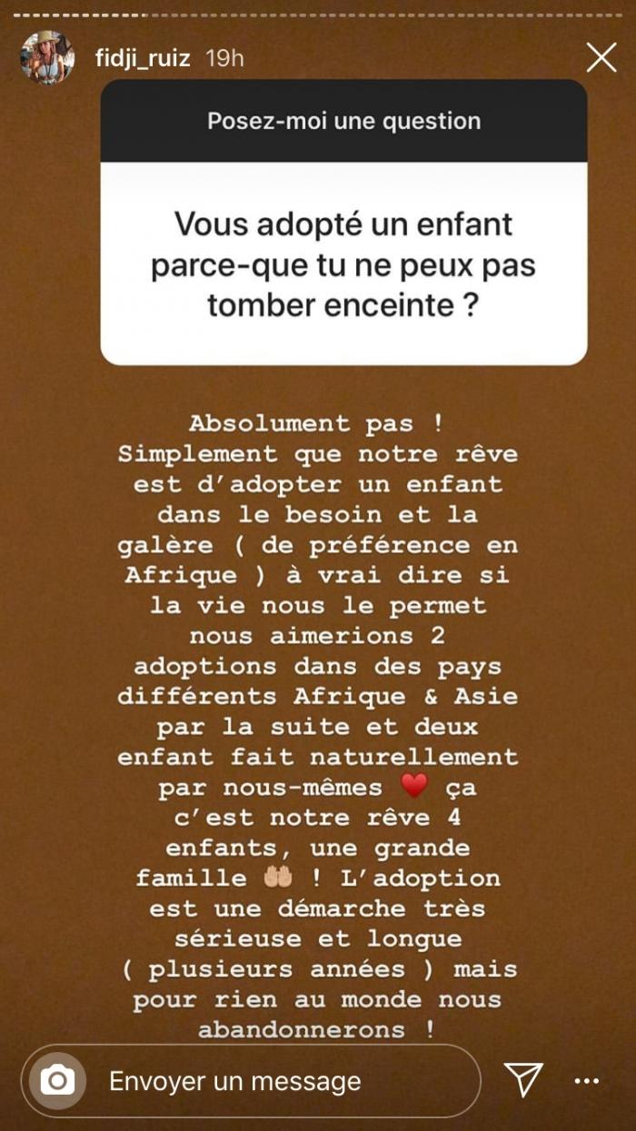 Un rêve qu'ils ont décidé de partager aux télespectateurs dans l'émission La bataille des couples 2. En effet, s'ils remportent la cagnotte les amoureux espèrent pouvoir adpoter deux enfants : l'un venant d'Afrique, l'autre venant d'Asie. C'est lors d'une session de questions/réponses que la jeune femme a apporté quelques précisions sur son compte Instagram.