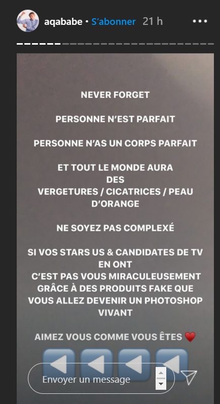 Eh oui, ce que le jeune homme pointe du doigt, ce sont les produits minceur que Jazz Correia et d'autrs influenceurs mettent en avant sur les réseaux sociaux. De la publicité mensongère, selon le jeune homme. Cependant, Aqababe a toutefois préféré supprimer le cliché polémique.