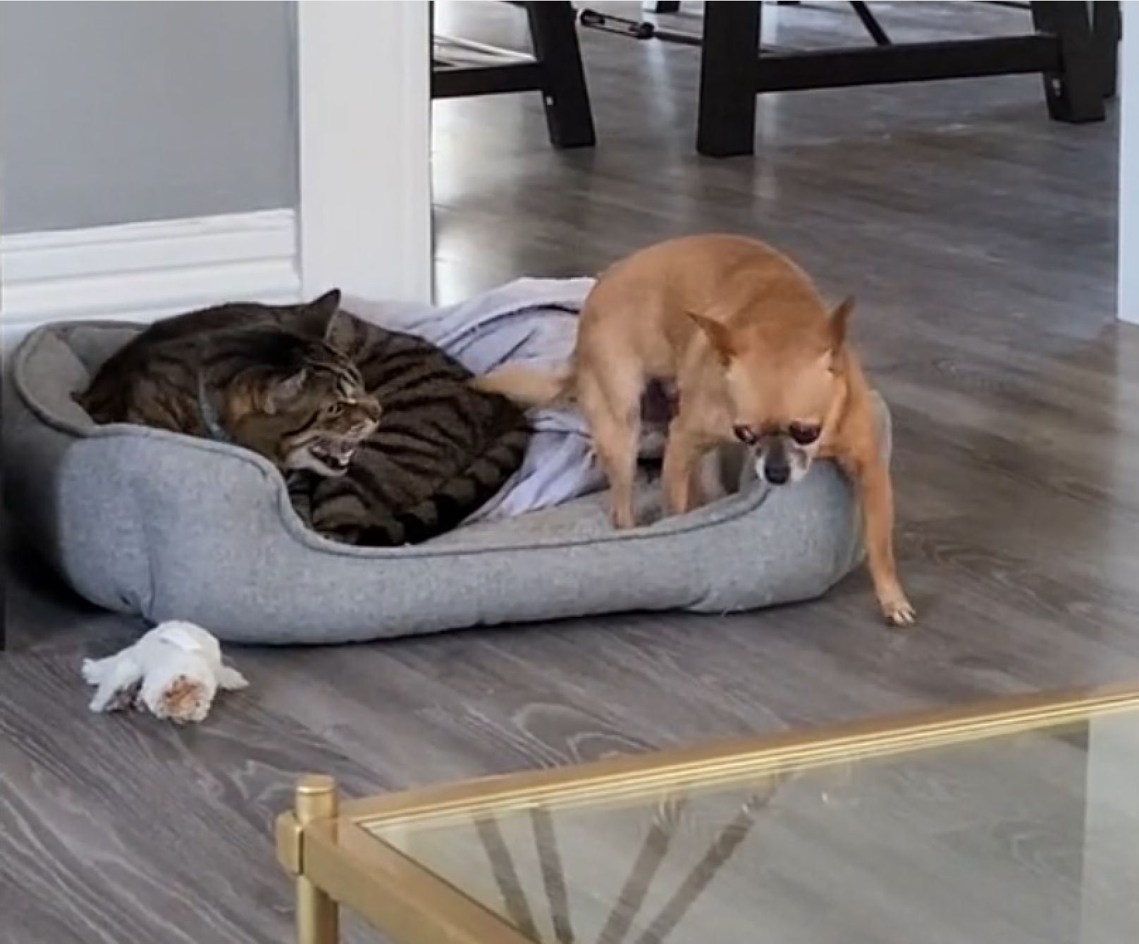 Effrayé par ce chat, ce chihuahua tente de se faire un place dans son panier